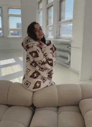 Jej kremowy kolor z geometrycznymi, etnicznymi wzorami w odcieniach brązu i beżu dodaje jej charakteru i ponadczasowego uroku. Luźny, oversize’owy krój zapewnia pełną swobodę ruchu, a szerokie rękawy i przestronny kaptur gwarantują maksymalny komfort i ciepło. Długość do kolan pozwala otulić się w całości i cieszyć prawdziwym relaksem.