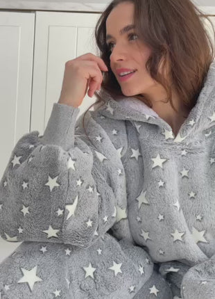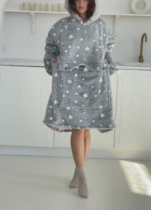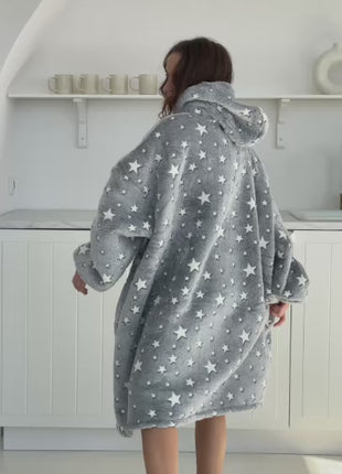 Jej stonowany, jasnoszary kolor z białymi gwiazdkami wprowadza spokój i przytulność, a zarazem dodaje subtelnego uroku. Luźny, oversize’owy krój gwarantuje pełną swobodę ruchu, a szerokie rękawy i obszerny kaptur zapewniają jeszcze więcej ciepła i wygody. Długość do kolan pozwala otulić się w całości – idealnie na chłodne poranki, leniwe wieczory czy zimowe weekendy.