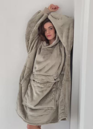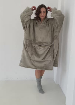 Jej stonowany beżowo-khaki kolor nadaje minimalistyczny, naturalny charakter, który pasuje do każdego wnętrza i nastroju. Luźny, oversize’owy krój gwarantuje pełną swobodę ruchu, a szerokie rękawy i obszerny kaptur zapewniają jeszcze więcej ciepła i wygody. Długość do kolan pozwala otulić się w całości – idealnie na spokojne poranki, wieczory z książką lub relaks po pracy.