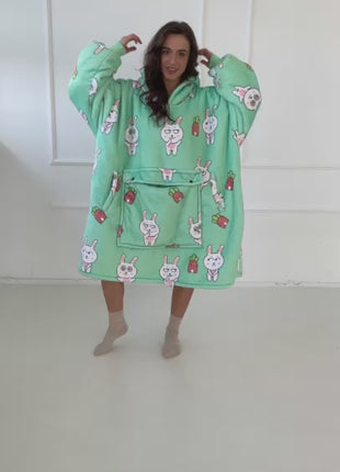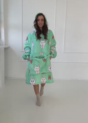 Jej jasnomiętowy kolor z zabawnymi nadrukami królików i mini marchewek nadaje jej wyjątkowo radosny charakter. Luźny, oversize’owy krój gwarantuje pełną swobodę ruchu, a szerokie rękawy i obszerny kaptur zapewniają dodatkowe ciepło. Długość do kolan otula całe ciało, zapewniając komfort w chłodniejsze dni.