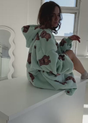 Jej pastelowy, miętowy kolor z nadrukiem uroczych brązowych misiów nadaje jej przyjazny i słodki charakter. Luźny, oversize’owy krój zapewnia pełną swobodę ruchu, a szerokie rękawy i obszerny kaptur otulają ciepłem, tworząc idealny strój na leniwy, domowy relaks.