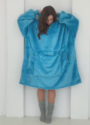 Jej intensywny niebieski kolor nadaje świeżości i energii, wprowadzając dobry nastrój od pierwszego spojrzenia. Luźny, oversize’owy krój gwarantuje pełną swobodę ruchu, a szerokie rękawy i obszerny kaptur otulają ciepłem i przytulnością. Długość do kolan pozwala otulić się w całości – idealnie na chłodne dni w domu lub podczas wypoczynku na zewnątrz.