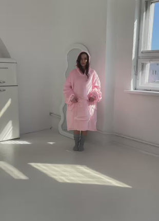 Jej delikatny pastelowy róż nadaje całości lekkości, radości i przytulnego charakteru. Luźny, oversize’owy krój zapewnia pełną swobodę ruchu, a szerokie rękawy i obszerny kaptur otulają ciepłem w chłodniejsze dni. Długość sięgająca za kolano gwarantuje pełne okrycie i komfort – niezależnie od tego, czy spędzasz wieczór na kanapie, czy pijesz poranną kawę na balkonie.