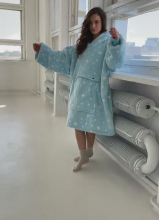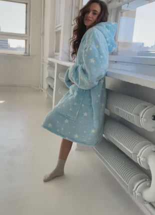 Jej jasnoniebieski kolor z nadrukiem świecących gwiazdek wprowadza bajkowy klimat i sprawia, że każdy wieczór staje się bardziej wyjątkowy. Luźny, oversize’owy krój zapewnia pełną swobodę ruchu, a szerokie rękawy i obszerny kaptur otulają ciepłem i miękkością. Długość do kolan gwarantuje pełne okrycie ciała i idealny komfort nawet w najchłodniejsze dni.